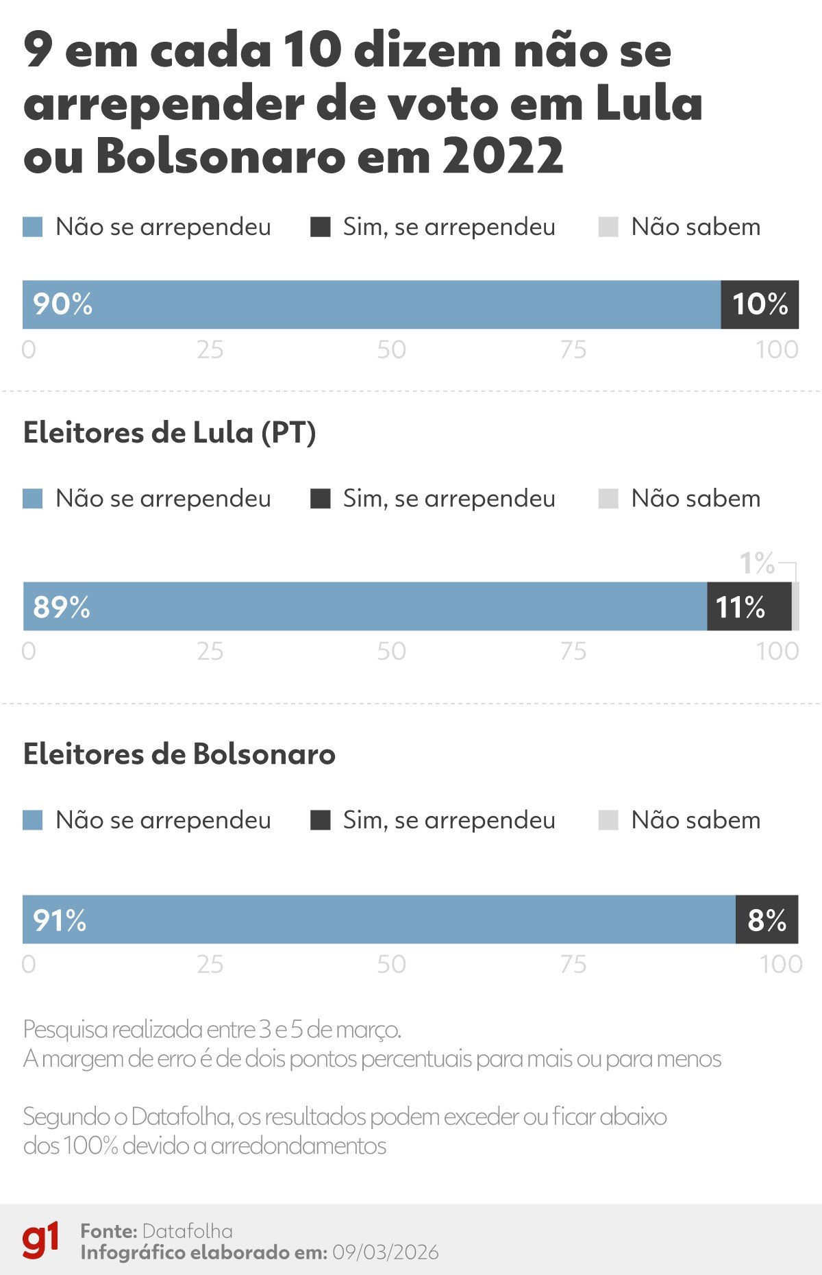 Pesquisa Datafolha divulgada nesta segunda-feira (9) aponta que 9 em cada 10 entrevistados não se arrependem de ter votado em Lula (PT) ou em Bolsonaro (PL) nas eleições para presidente de 2022.