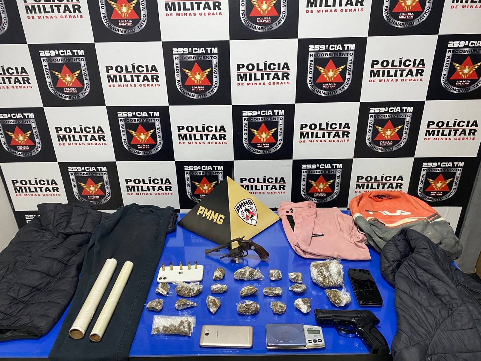 Após levantamento de informações, dois suspeitos do crime, ambos de 17 anos, foram localizados em uma casa no bairro São João. No imóvel, os policiais apreenderam maconha, um revólver, um simulacro de arma de fogo e uma balança de precisão.