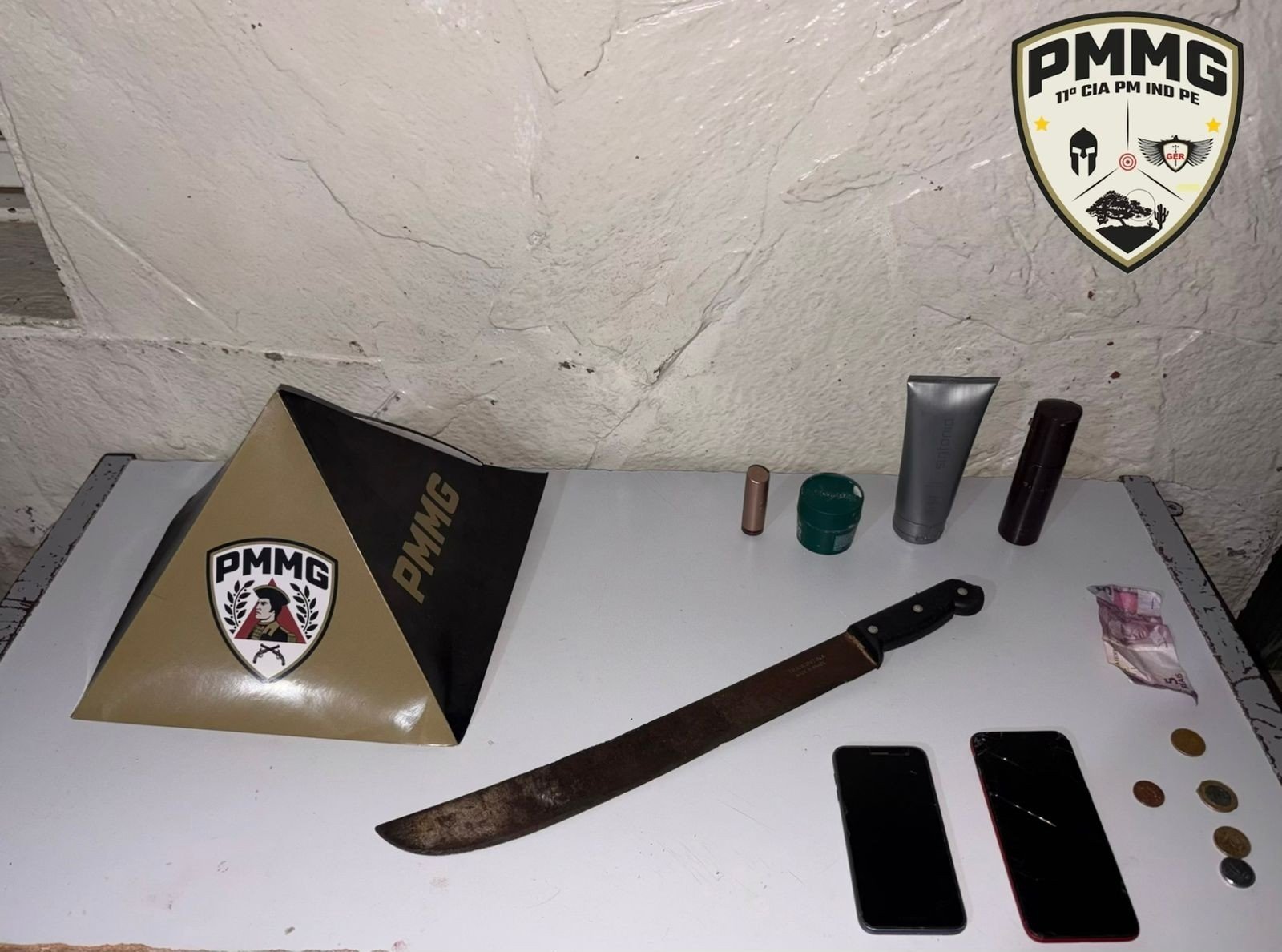 Durante a busca, os policiais encontraram uma sacola, dois celulares e uma pequena quantia em dinheiro. Questionada sobre a origem dos objetos, a mulher permaneceu em silêncio.