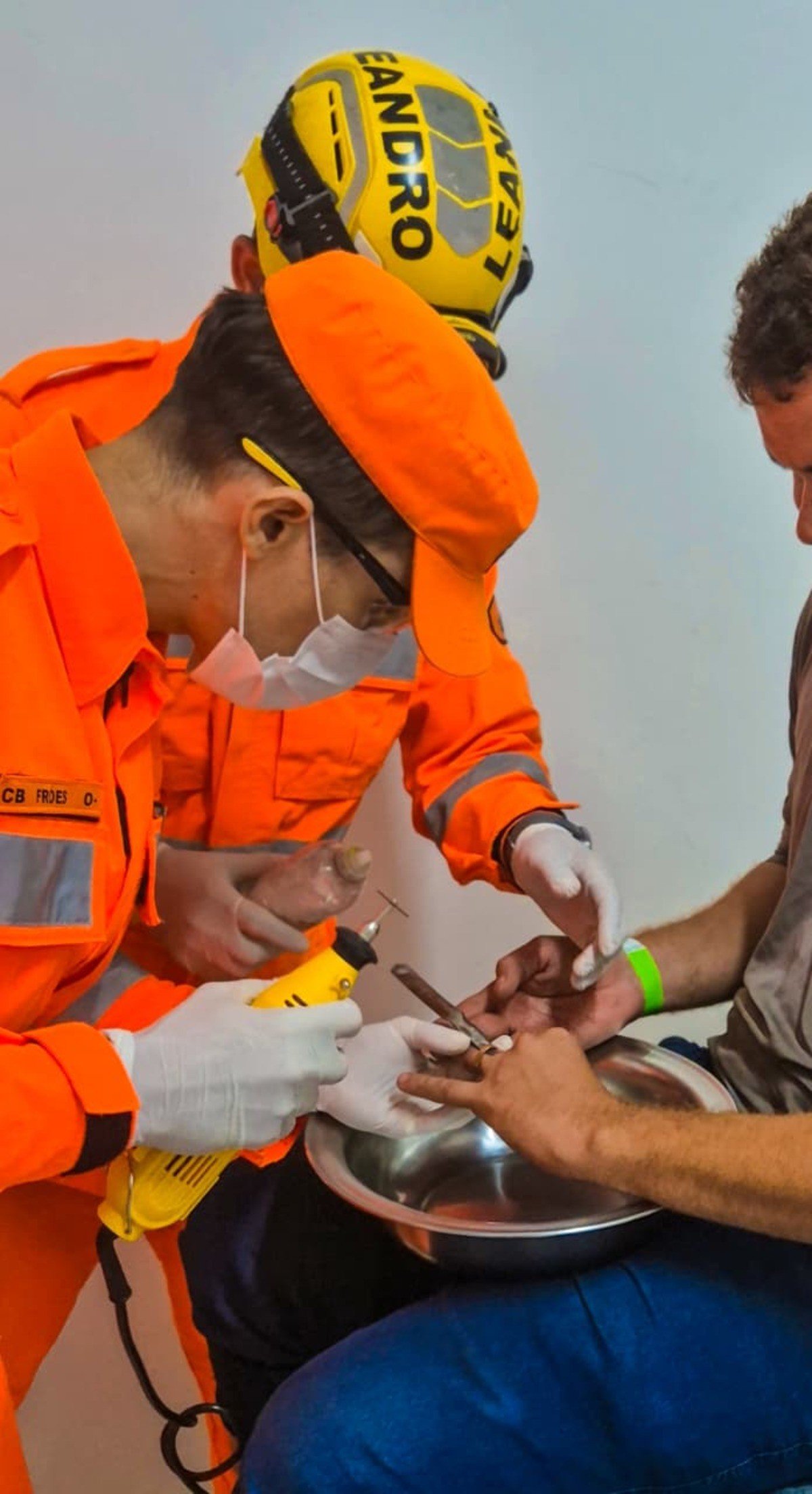 Os militares realizaram a estabilização do dedo e fizeram o corte controlado da aliança com o auxílio de um kit de mini retífica. (Veja acima) O procedimento foi realizado com técnica adequada para evitar o agravamento das lesões. A aliança foi removida, preservando a integridade do dedo e possibilitando a continuidade do atendimento médico.