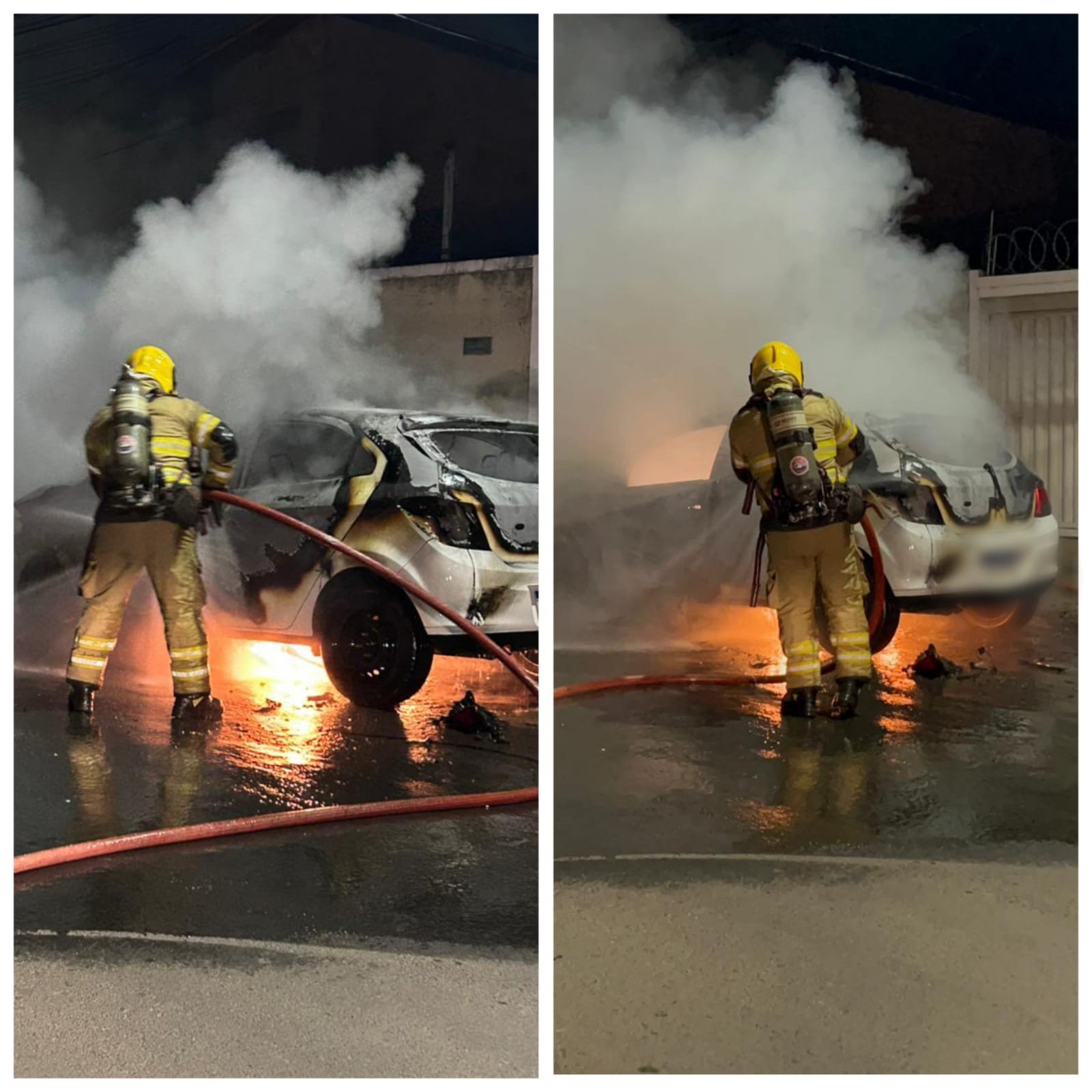 O fogo se alastrou rapidamente, e o automóvel foi completamente destruído. O incêndio não atingiu o caminhão porque o proprietário conseguiu retirar o veículo a tempo.