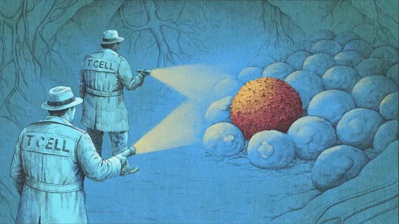 Os inibidores de checkpoint imunológico evitam que isso aconteça, fazendo com que as células T identifiquem as células cancerosas como ameaça e deem início a um ataque.
