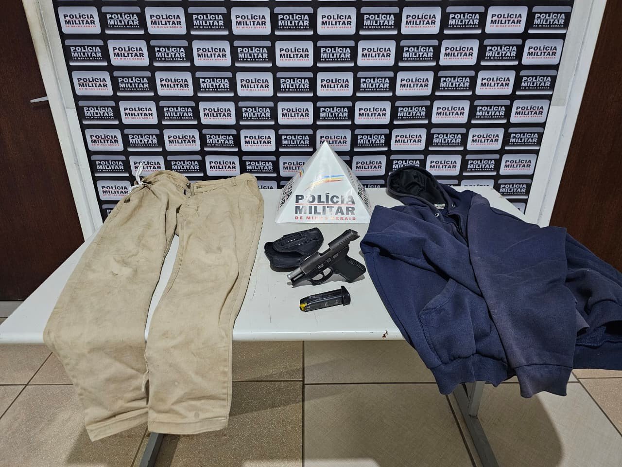 Enquanto fazia buscas, a PM foi informada de que a arma roubada havia sido jogada na estrada do bairro Olaria. No local, os militares apreenderam uma pistola dentro de um pote de plástico.