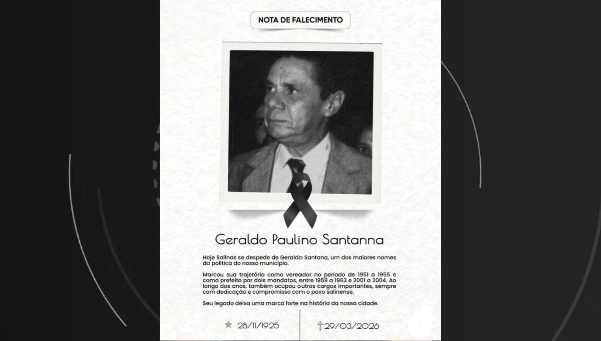 Morreu neste domingo (29), aos 100 anos, o ex-prefeito de Salinas, no Norte de Minas, Geraldo Paulino Santanna. A informação foi divulgada pela Câmara de Salinas nas redes sociais. Ele nasceu em 28 de novembro de 1925 e teve trajetória marcada pela atuação política no município e no estado de Minas Gerais.