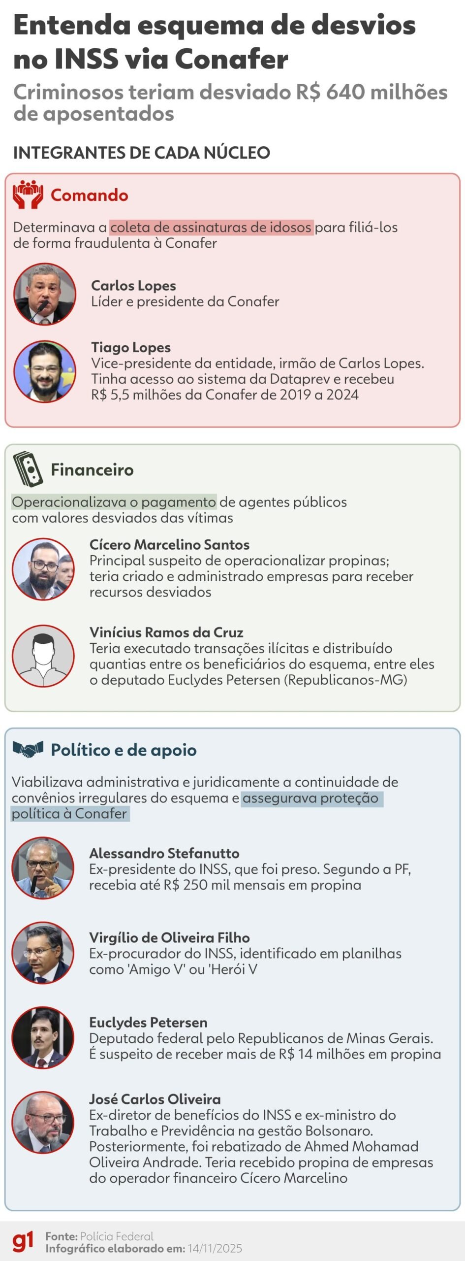 A Polícia Federal descreveu a existência de três núcleos de pessoas, com divisão de tarefas e hierarquia, que atuaram na suposta organização criminosa que desviou R$ 640 milhões de aposentados e pensionistas do INSS por meio da Confederação Nacional de Agricultores Familiares e Empreendedores Familiares Rurais (Conafer).