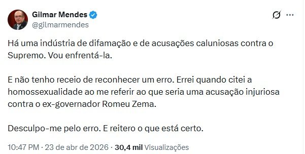“Errei quando citei a homossexualidade ao me referir ao que seria uma acusação injuriosa contra o ex-governador Romeu Zema”, disse Gilmar Mendes. “Desculpo-me pelo erro. E reitero o que está certo”, concluiu.