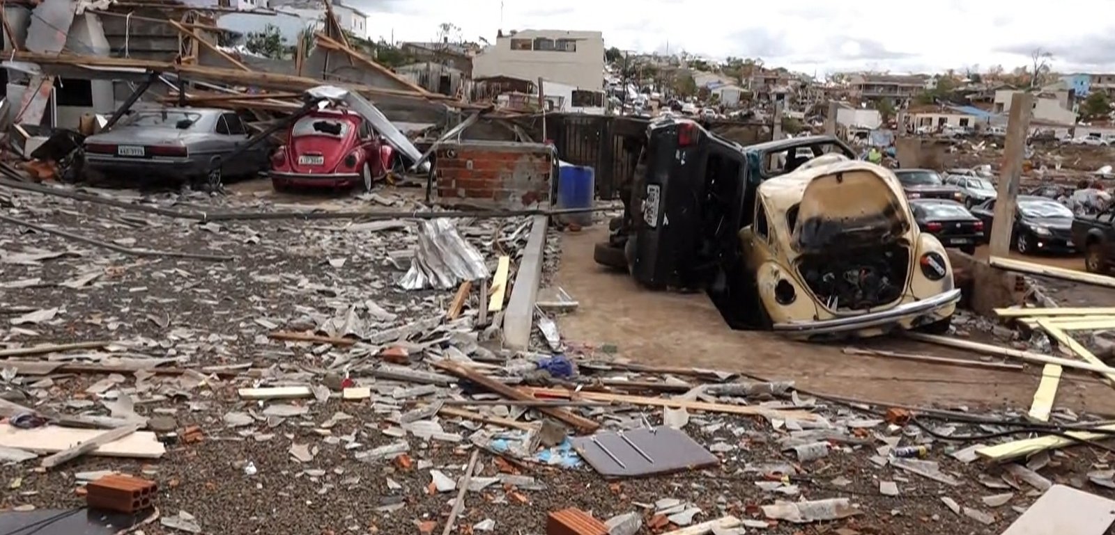 Os ventos fortíssimos arrancaram árvores e postes devastaram casas. Mais de mil pessoas estão desabrigadas. Bombeiros e agentes da Defesa Civil buscam sobreviventes sob escombros.