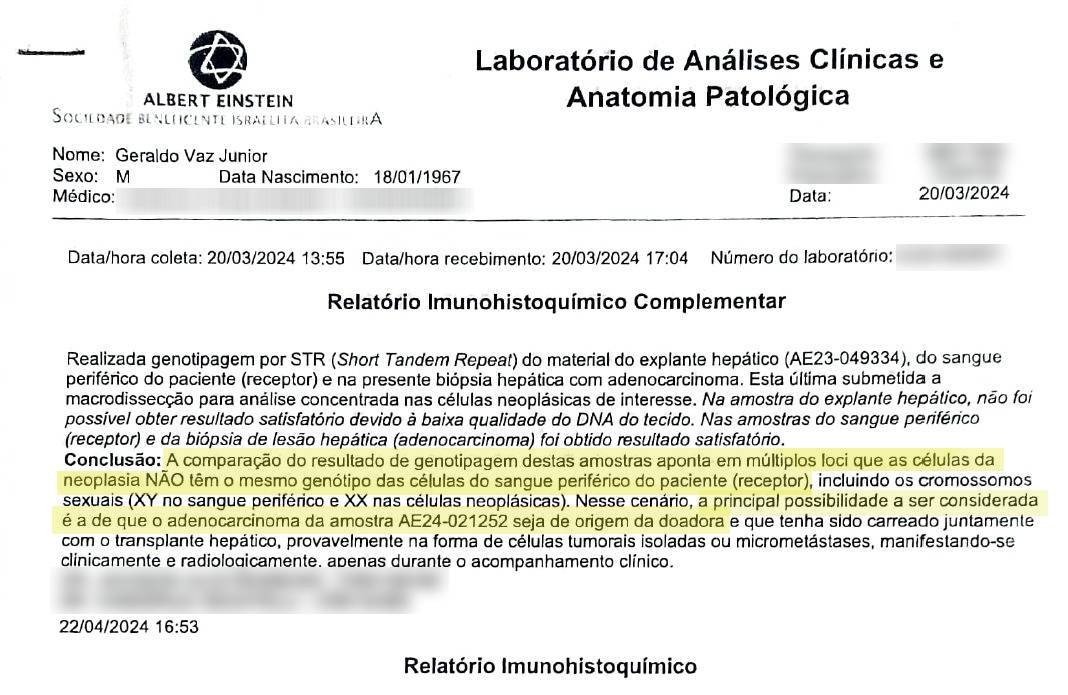 O g1 teve acesso aos exames. A biópsia identificou um adenocarcinoma, um tipo de tumor maligno, e um teste genético de DNA confirmou que as células cancerígenas não pertenciam ao paciente, mas ao doador do órgão. (Veja abaixo)
