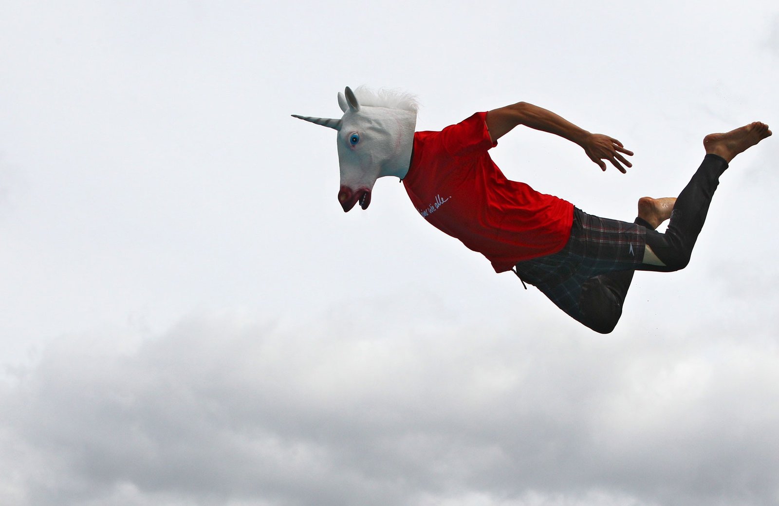 Vestindo uma máscara de unicórnio, jovem salta para mergulhar em uma piscina pública durante competição em Schweinfurt, na Alemanha (foto ilustrativa)