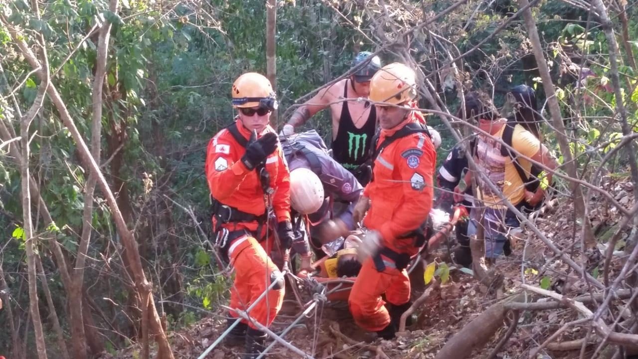 As pessoas que estavam no local o descem até o chão. Um bombeiro de folga, que estava na cachoeira, prestou os primeiros socorros.