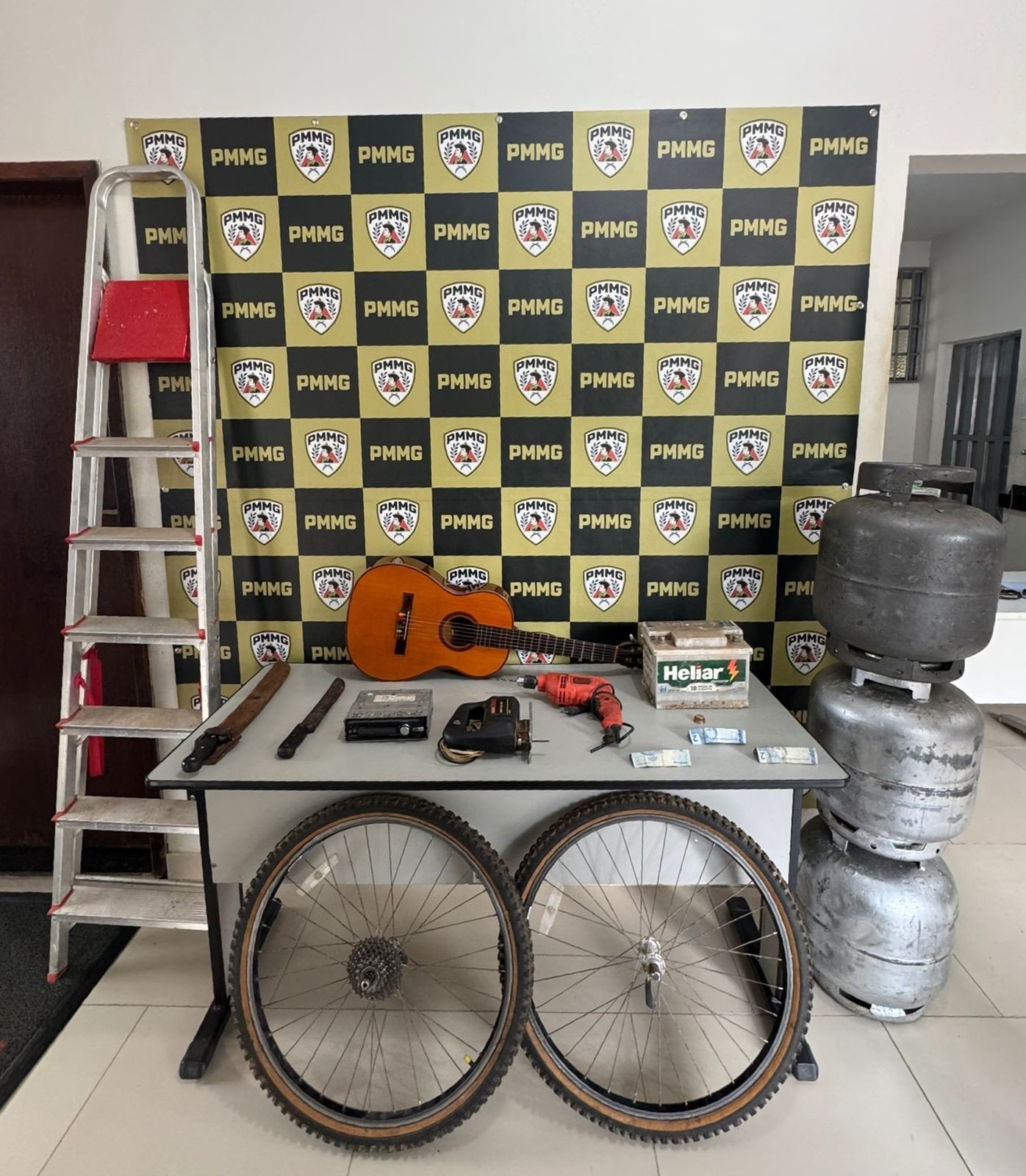 Segundo a Polícia Militar, foram recuperados: três botijões de gás, uma escada, uma furadeira, uma serra, uma bateria veicular, um rádio automotivo, um violão, duas rodas de bicicleta e um carrinho de mão.