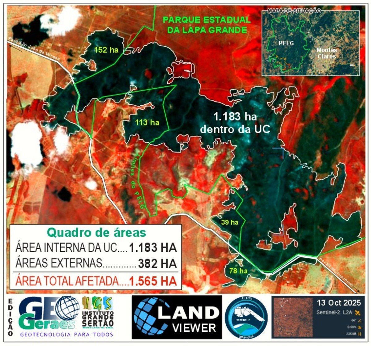 Segundo o Corpo de Bombeiros, o primeiro foco foi identificado em 2 de outubro e os trabalhos começaram no dia seguinte. As altas temperaturas e os ventos constantes dificultavam o combate. A área queimada foi de 1.565 hectares. Um vídeo divulgado pelo Instituto Grande Sertão mostra parte dos trechos afetados. (Veja acima)