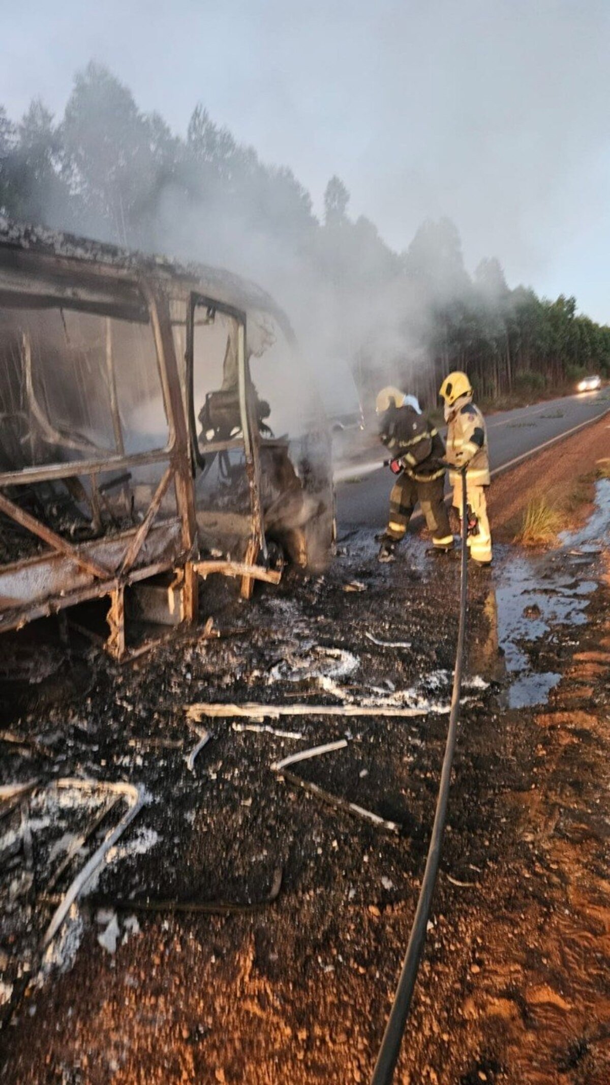 Um micro-ônibus que transportava um time de futebol foi destruído por um incêndio na MG-214, em Itamarandiba, nesse domingo (19).