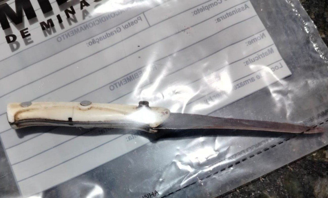 Quando os policiais chegaram, se depararam com o suspeito agitado na porta da casa onde o assassinato ocorreu. Perto dele havia uma faca com 22 centímetros, sendo 11 de lâmina.