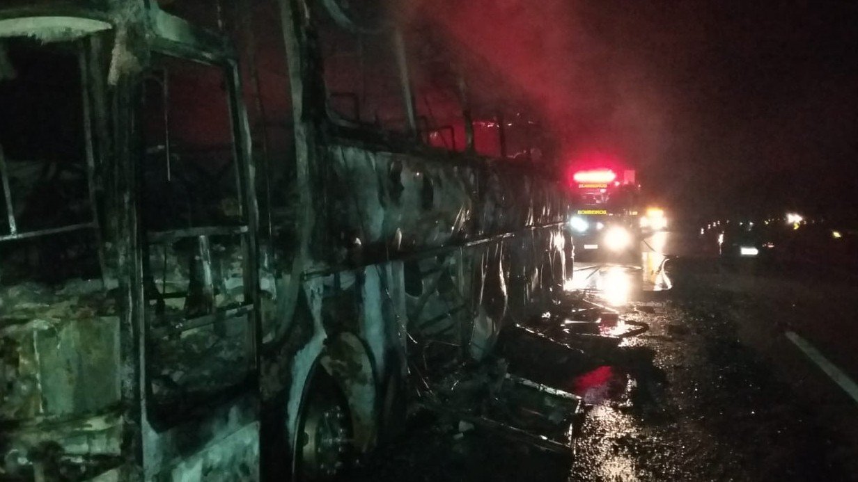 Ônibus de turismo ficou totalmente destruído após pegar fogo em MG