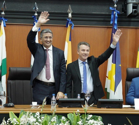 Antonio Denarium e Edilson Damião (de gravata vermelha) quando tomaram posse como governador e vice em Roraima
