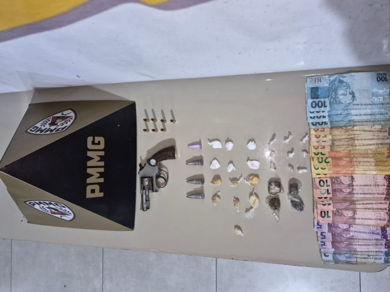 Policiais apreenderam um revólver em uma lata enterrada, drogas em um guarda-roupa e dinheiro embaixo de um colchão após denúncias sobre um esquema de “tele pó” em Montes Claros. Um homem foi preso.