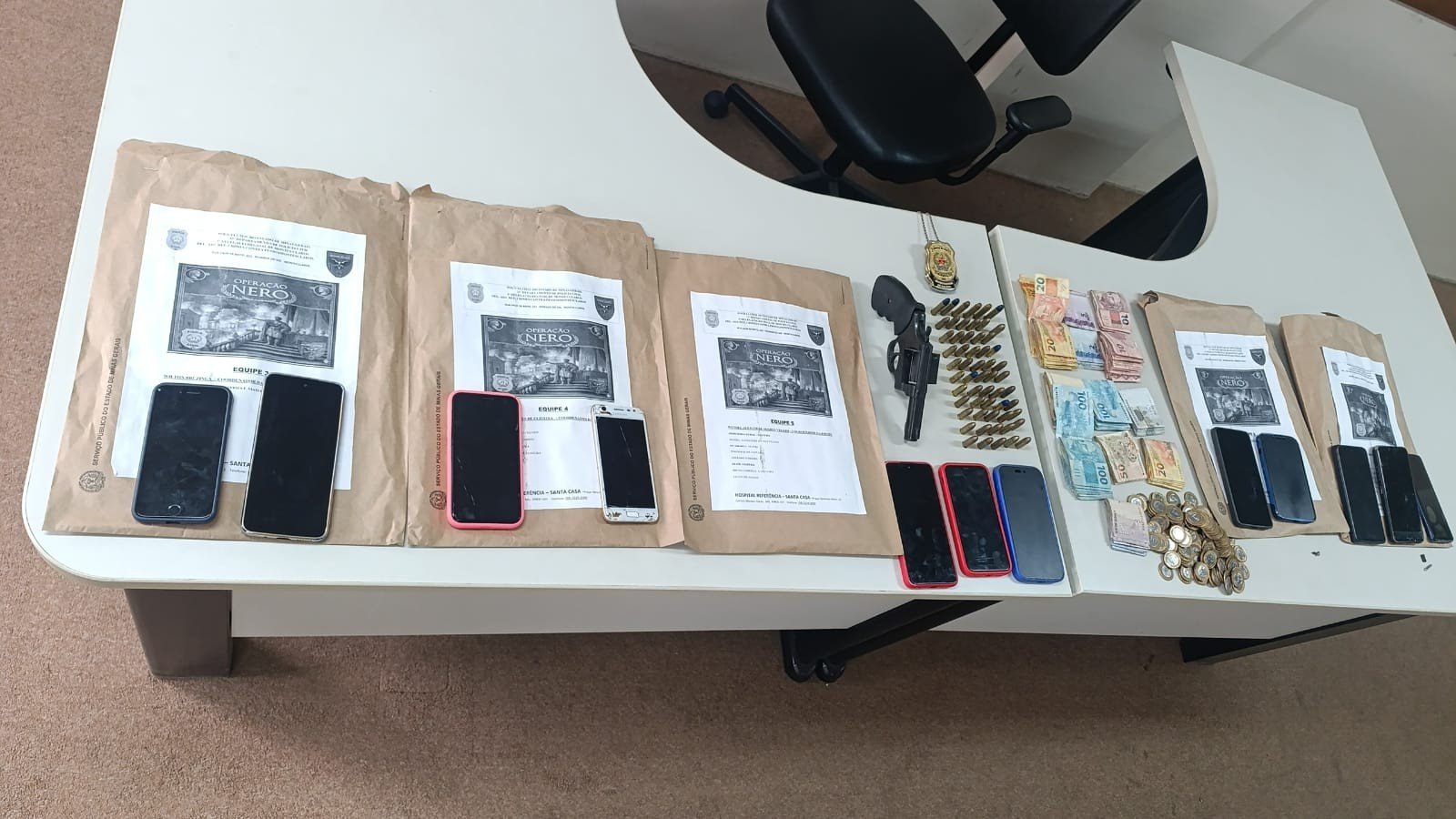 A ação resultou na apreensão de 13 aparelhos celulares, R$ 6.480 em dinheiro, um revólver calibre 38, 50 munições calibre 9 mm, seis munições calibre .38 e uma munição calibre .40.