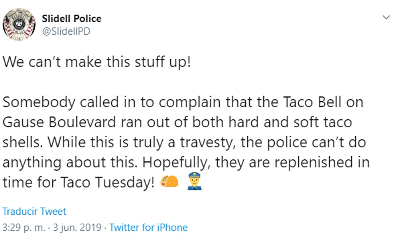 A polícia de Slidell, na Louisiana, informou nesta segunda-feira (3) que recebeu reclamações de que um restaurante da rede Taco Bell estava sem massa para tacos, prato típico mexicano.