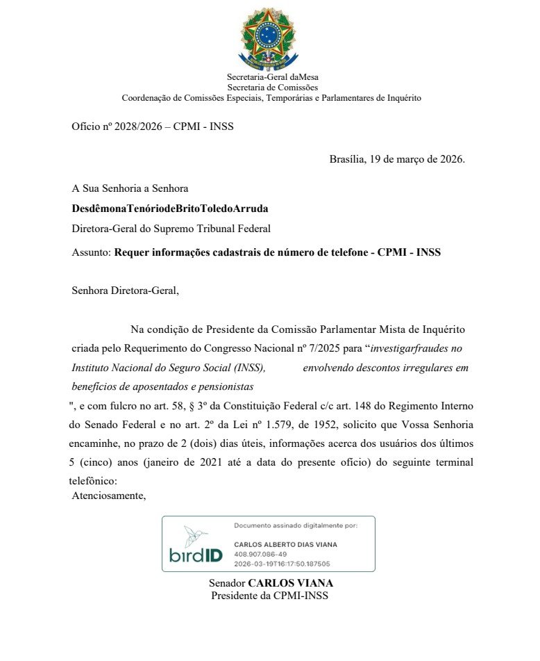 O presidente da CPMI do INSS, senador Carlos Viana (Podemos-MG), encaminhou ofício à diretora-geral do Supremo Tribunal Federal (STF) — responsável pela administração da Corte —, nesta quinta-feira (19), para identificar formalmente o usuário de um aparelho de celular de titularidade do Supremo que trocou mensagens com o empresário Daniel Vorcaro, dono do Banco Master.