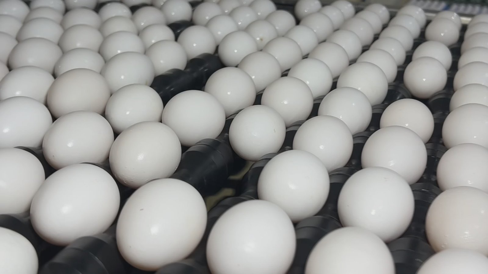 Os ovos são transportados por esteiras até a área de seleção, onde passam por triagem, lavagem e classificação por peso antes de serem direcionados para as caixas e enviados para comercialização.
