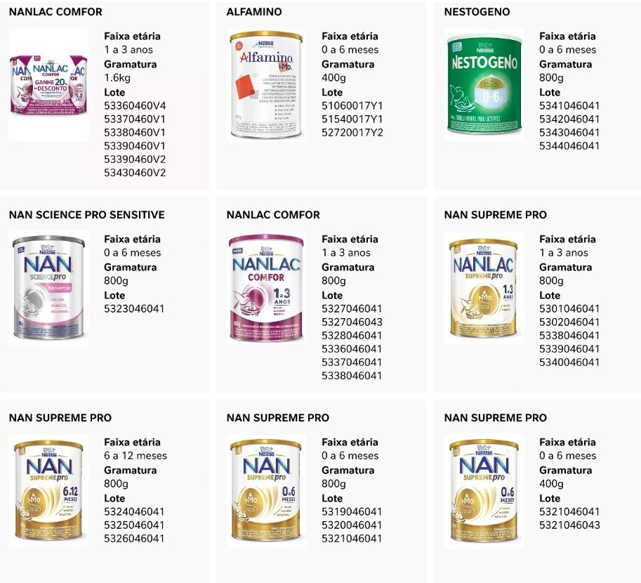 As autoridades de saúde reforçam que produtos incluídos nos recalls não devem ser consumidos. Pais e cuidadores devem procurar orientação médica caso observem sintomas compatíveis com intoxicação alimentar após o uso de fórmulas dos lotes afetados.