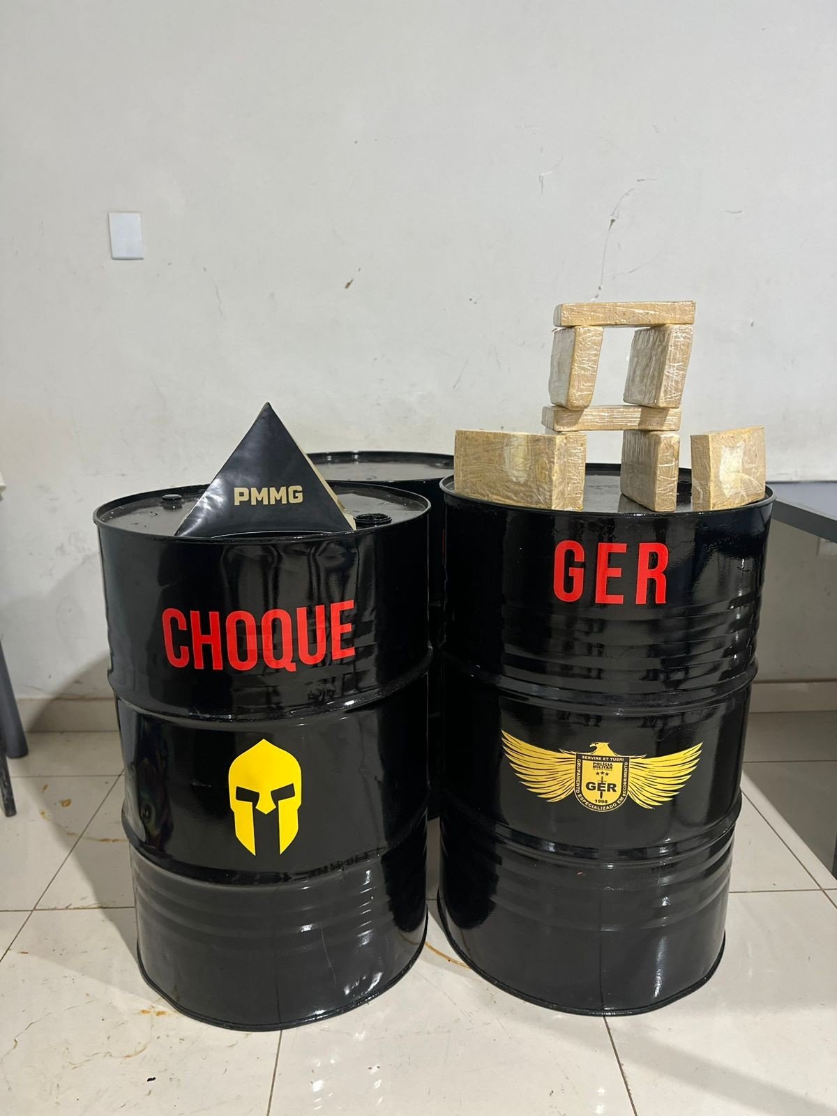 Em seguida, os policiais fizeram buscas pelo trajeto de fuga e apreenderam uma caixa de papelão com oito barras de cocaína.