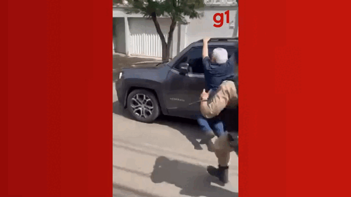 As imagens registradas por testemunhas mostram o momento em que o carro está em movimento lento, com o idoso pendurado na porta do motorista, tentando impedir a fuga. Um policial corre ao lado do veículo e tenta afastá-lo, mas o criminoso acelera e o homem é arrastado por alguns metros. Logo depois, uma viatura da Polícia Militar entra na rua em alta velocidade para iniciar o cerco.